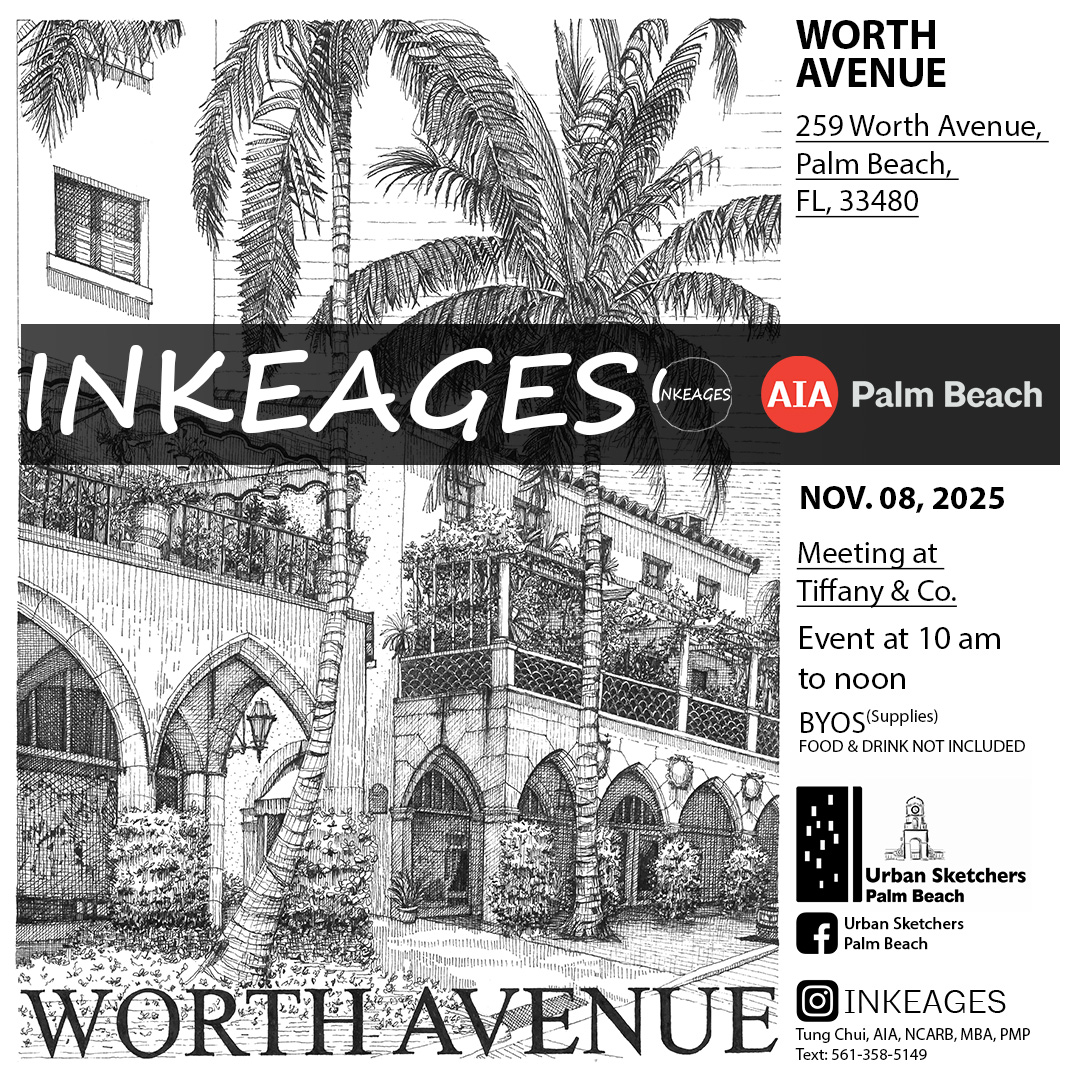 Join the Inkeages Sketch Groupand Urban Sketchers on Saturday, Nov. 8, 2025, from 10 a.m. to 12 p.m. on Worth Avenue in front of Tiffany & Co. located at 259 Worth Ave for a morning of sketching. Inkeages is the fusion of Ink drawing and lineages. The group's mission is to preserve and revive the lost art of architect's hand sketching. It conveys a sense of heritage and lineage in the art form.