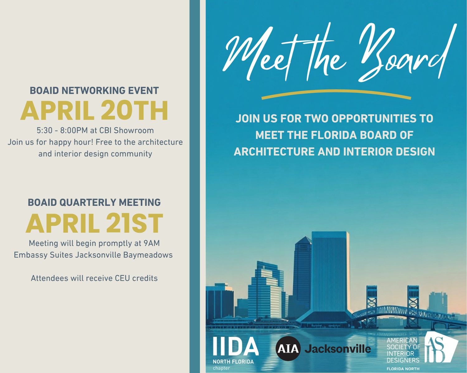 This quarter's BOAID meeting will take place in Jacksonville, providing local designers the opportunity to meet those who serve our profession.