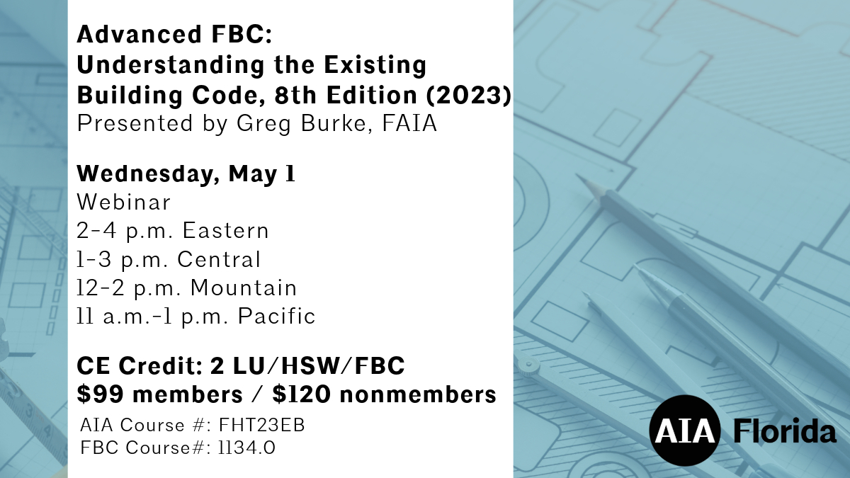 Web Site: https://www.cognitoforms.com/AIAFlorida1/AdvancedFBCUnderstandingTheExistingBuildingCode8thEdition2023May12024